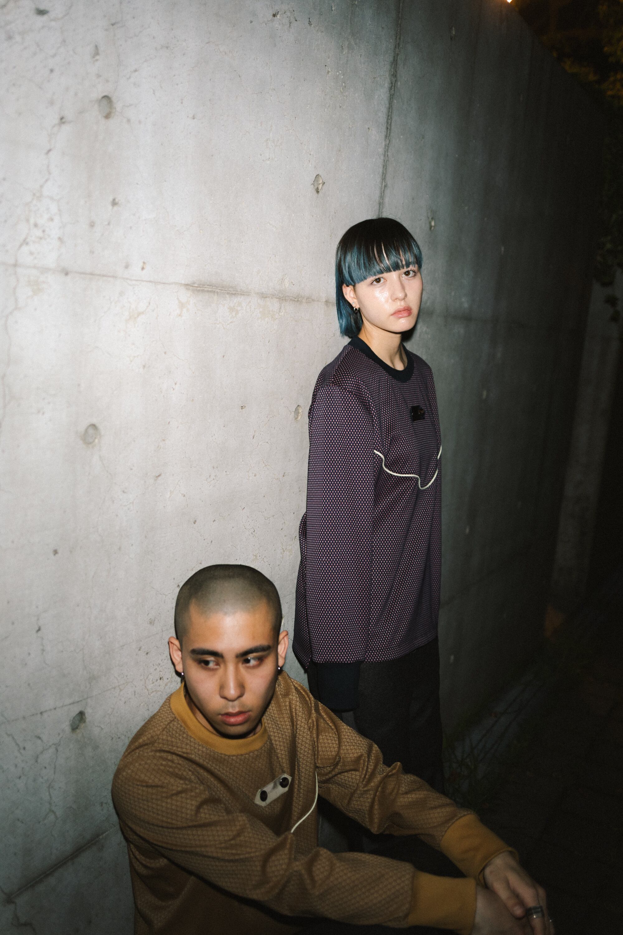 胸元中央には、取り外し可能なタブパーツを配置し、動物家紋から着想を得た鹿柄ロゴ入りのスコッチボタンをあしらって、デザインに遊びを効かせた。