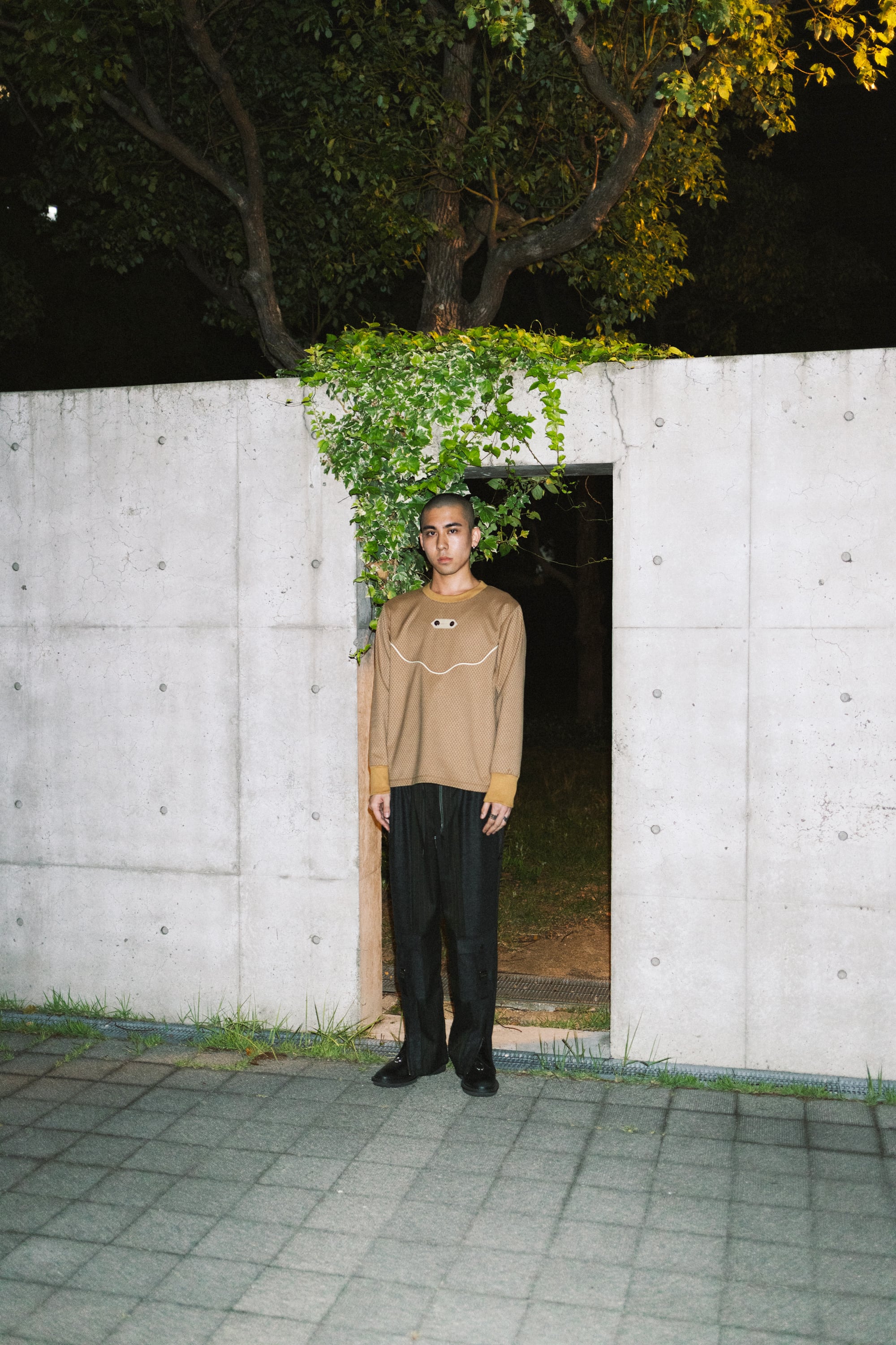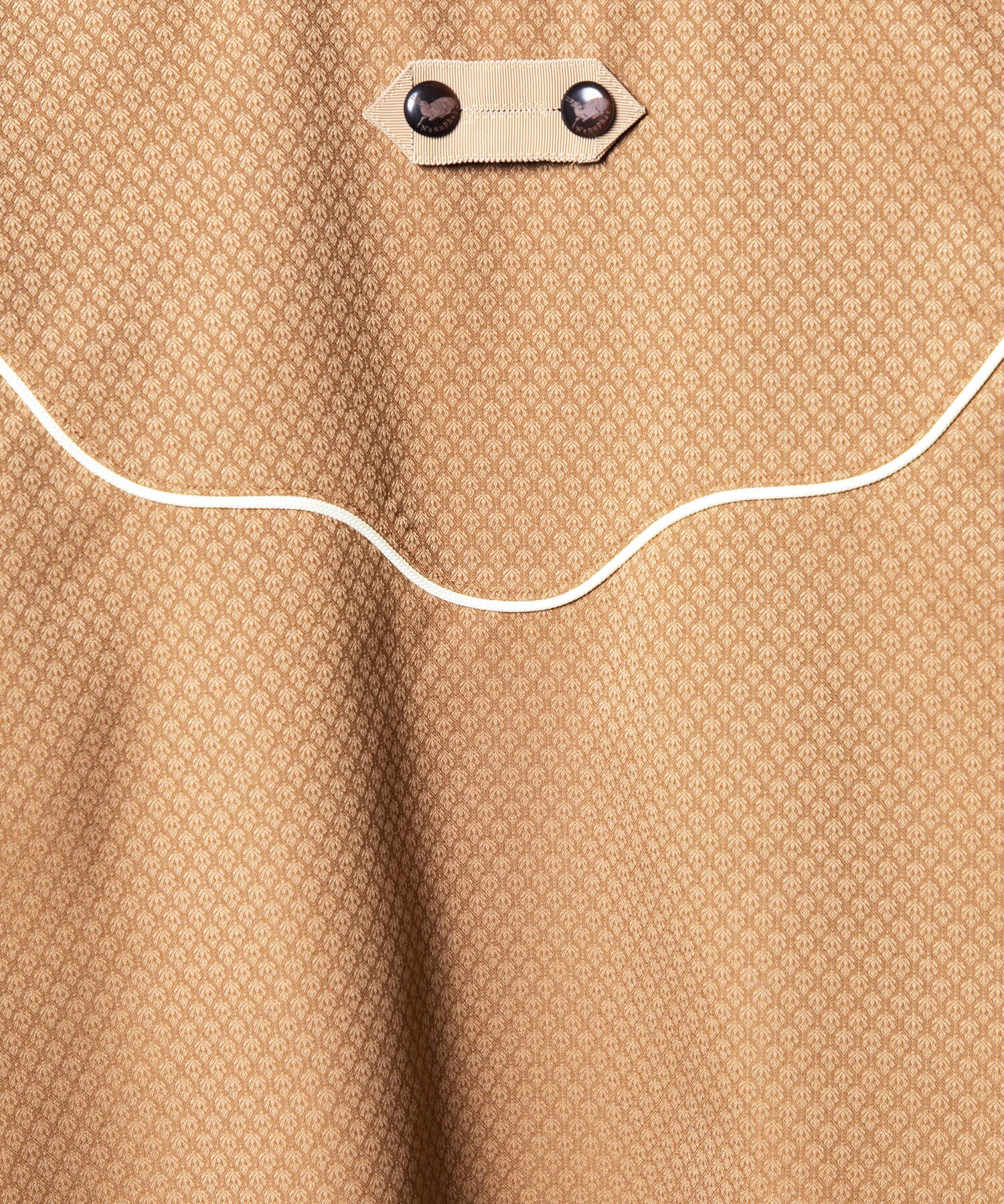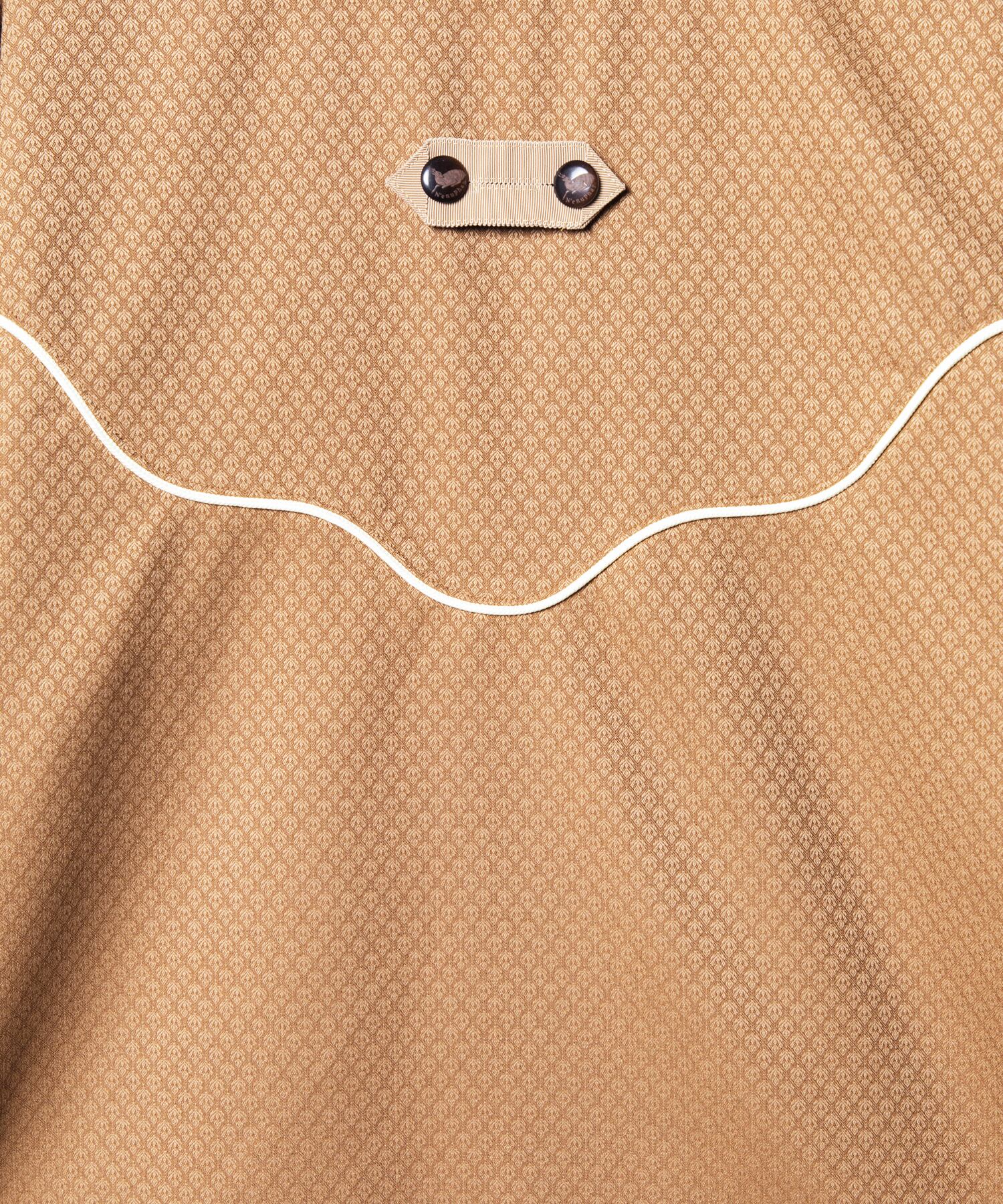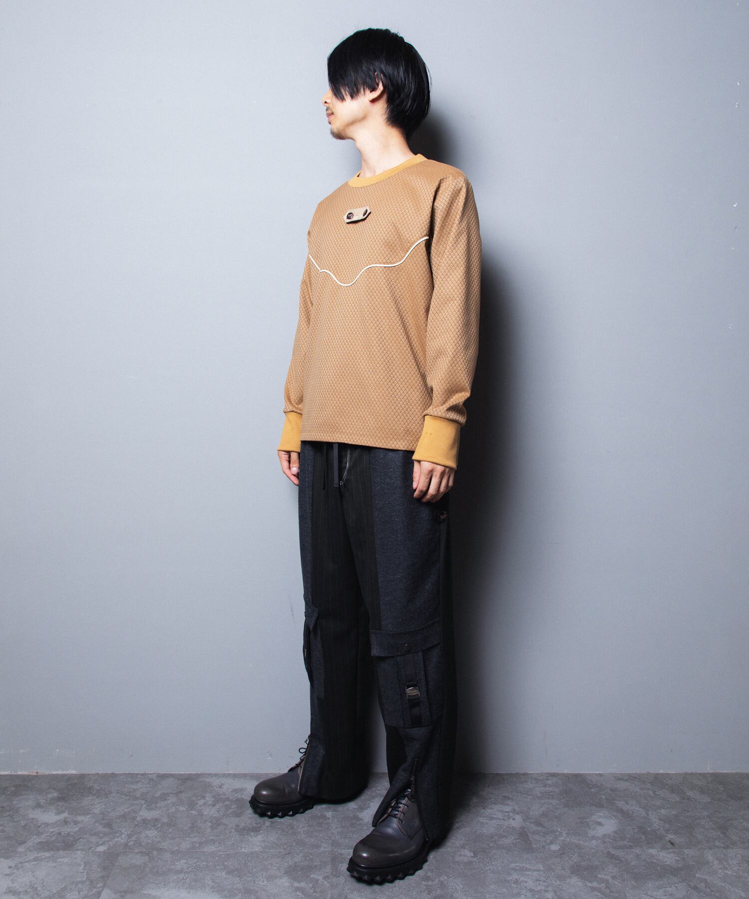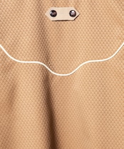 胸元中央には、取り外し可能なタブパーツを配置し、動物家紋から着想を得た鹿柄ロゴ入りのスコッチボタンをあしらって、デザインに遊びを効かせた。