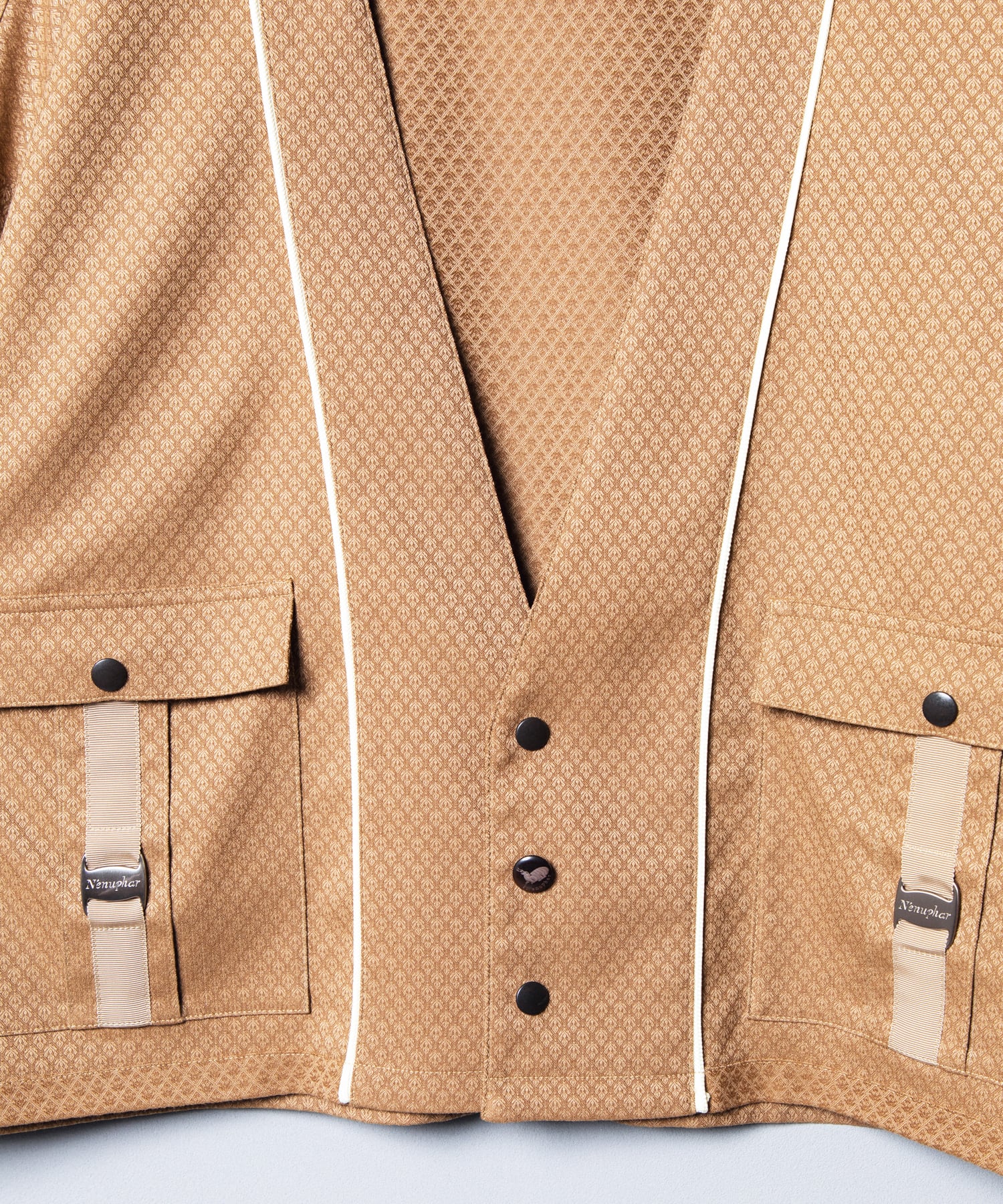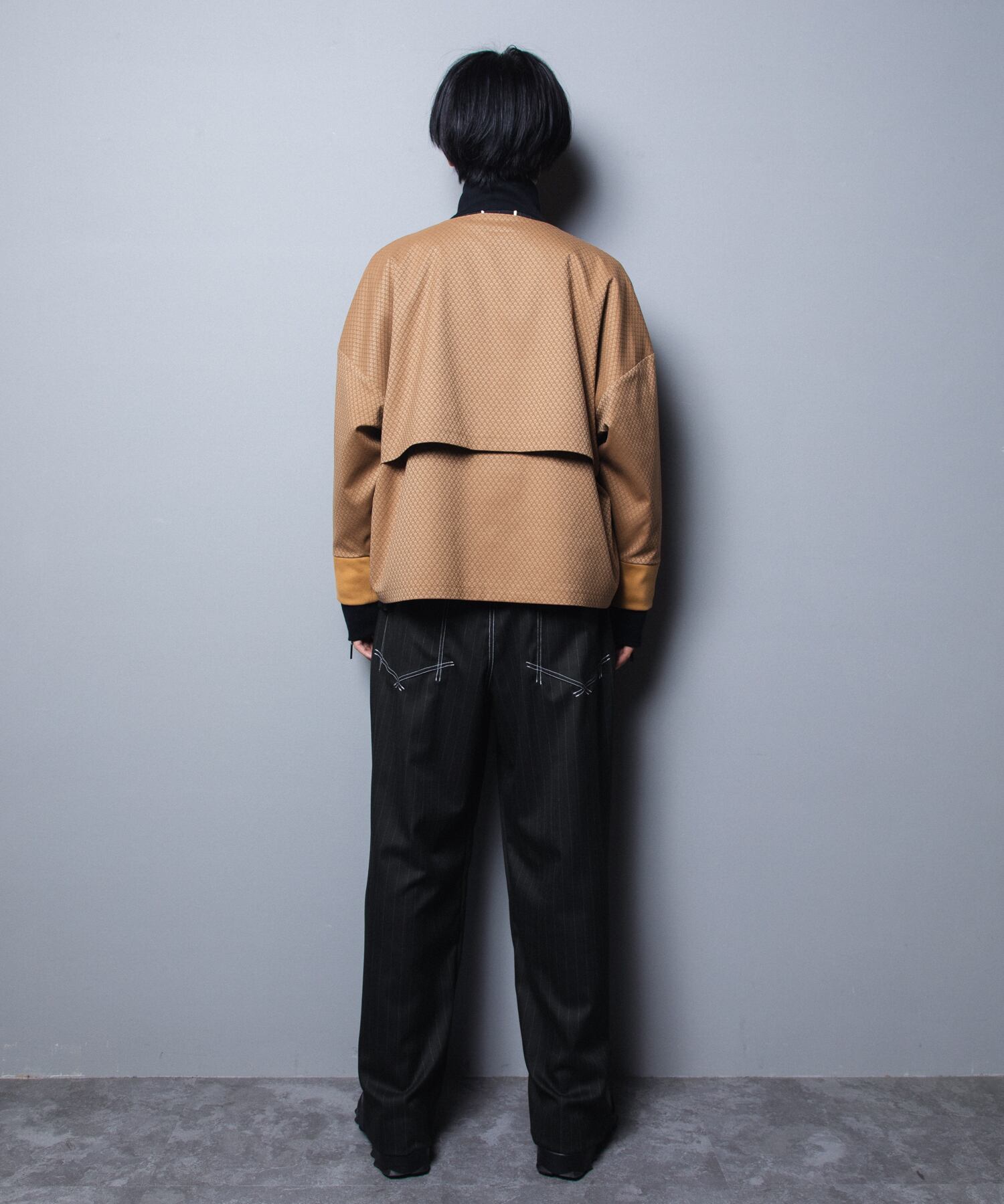 裏前身返しをあえて表側に見せ、生地端にはパイピングテープを挟み込むことで、スポーティーな印象に仕上げた。