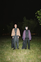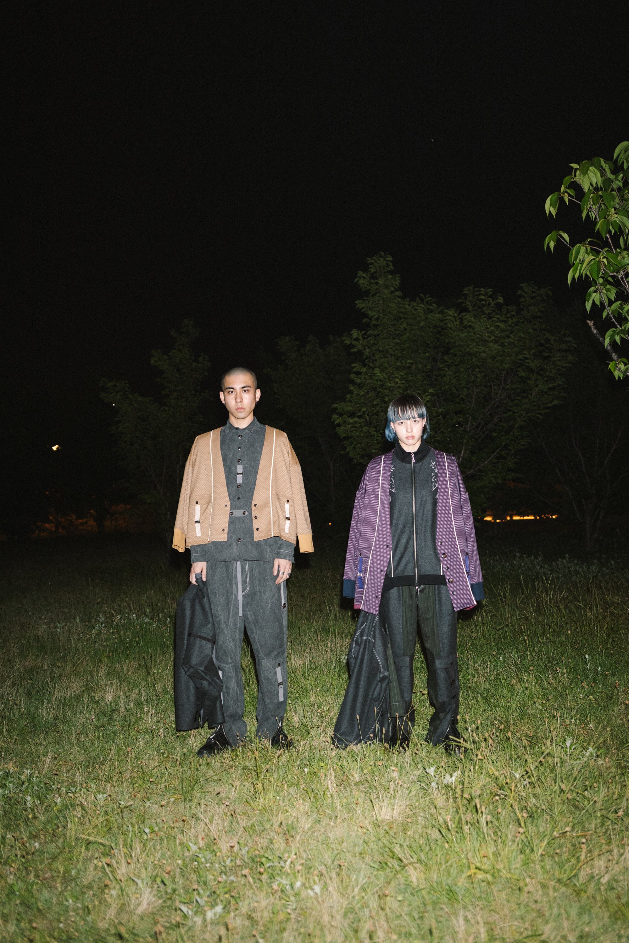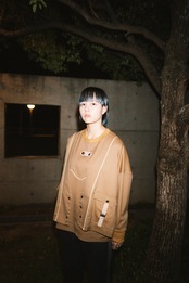 前開き部分には、動物家紋から着想を得た鹿柄のロゴ入りスコッチボタンやドットボタンなど、異なる種類のボタンを組み合わせ、デザインに遊びを効かせた。