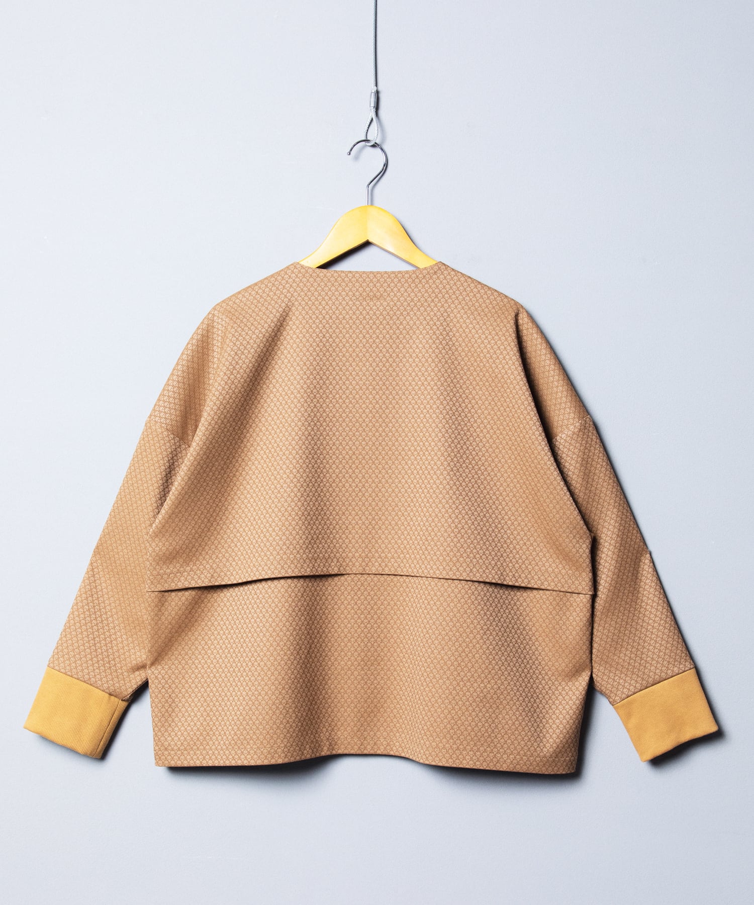 身生地には、最大20枚の組織を組むことができる織機で織られた、ジャガードのように複雑な幾何学模様のニットスウェット素材を使用。