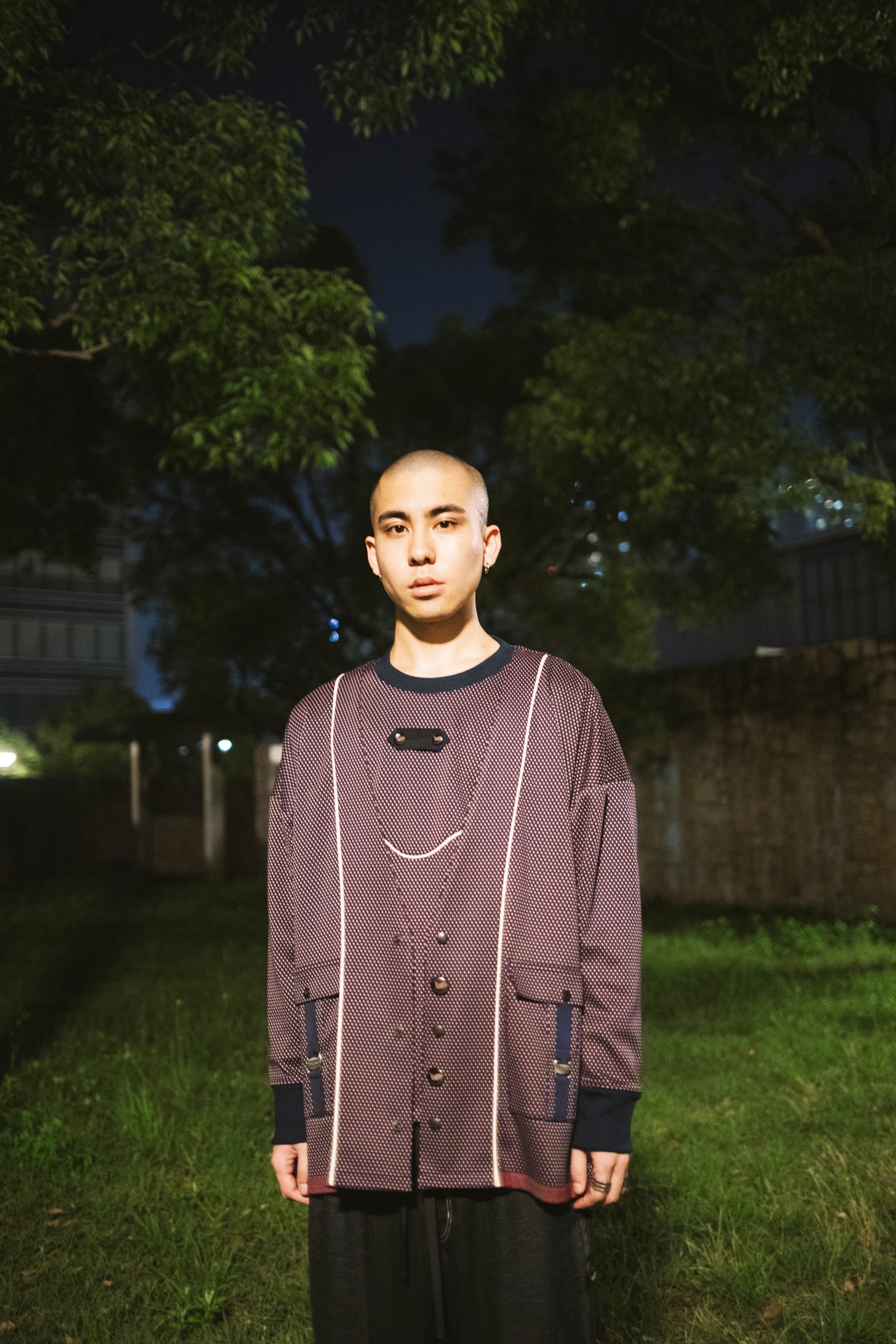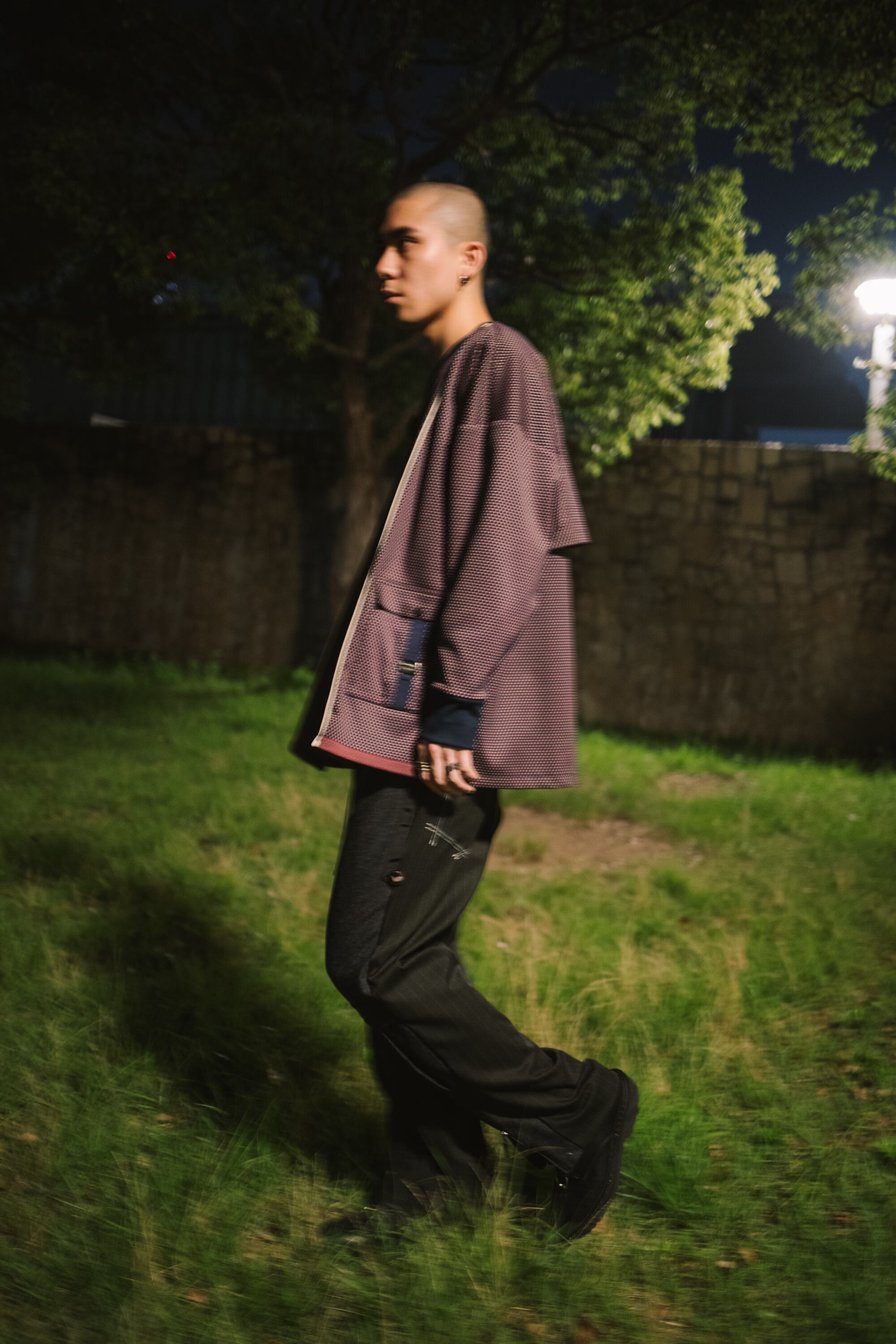 前開き部分には、動物家紋から着想を得た鹿柄のロゴ入りスコッチボタンやドットボタンなど、異なる種類のボタンを組み合わせ、デザインに遊びを効かせた。