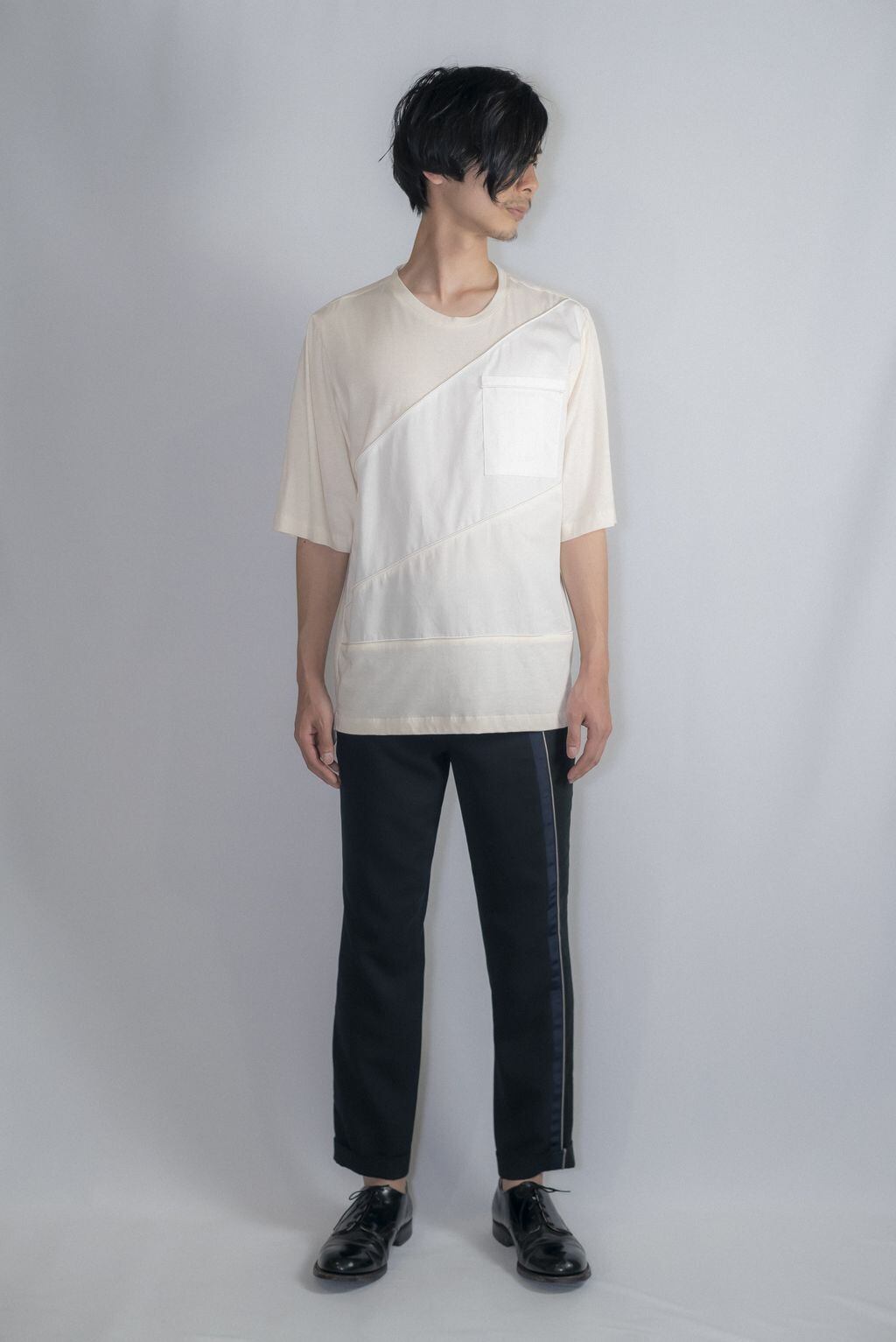 左胸にはプリーツパッチポケットをあしらい、布帛生地と天竺生地をレーヨンパイピングテープを挟み込んだエッジの効いた切り替えに。