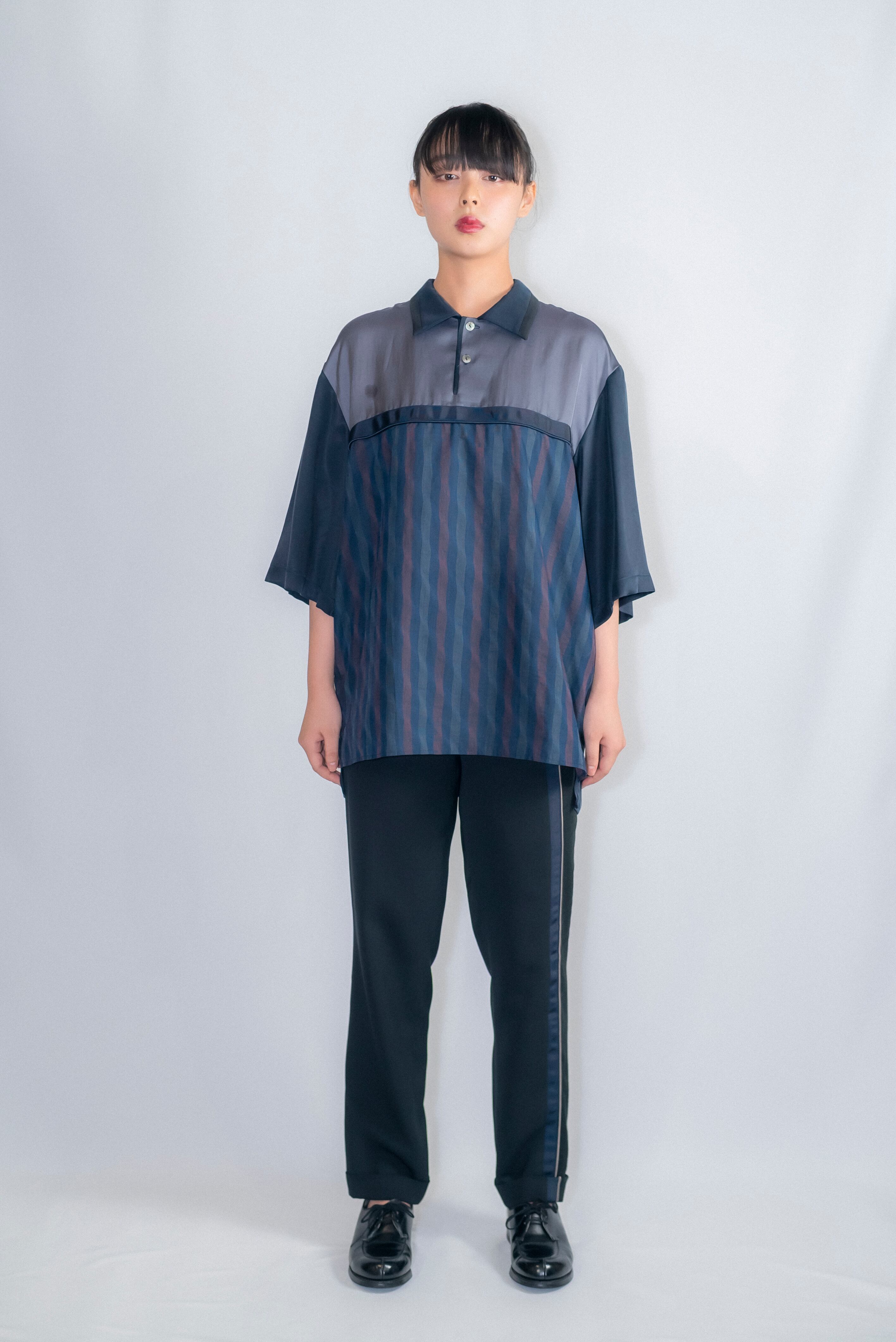 前開きをシャツ生地でポロシャツ仕様にする事で、モードカジュアルな雰囲気に仕上げた。
