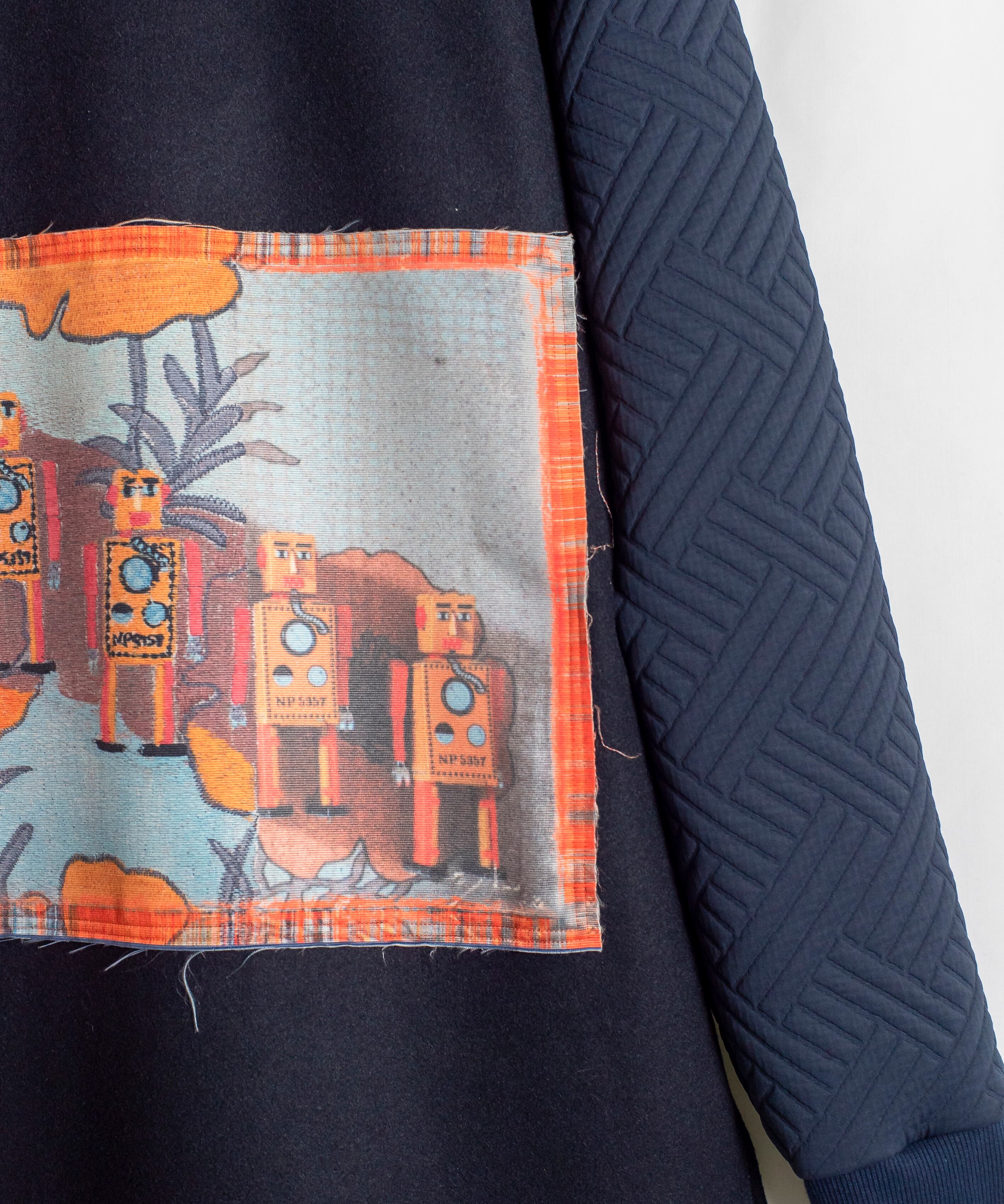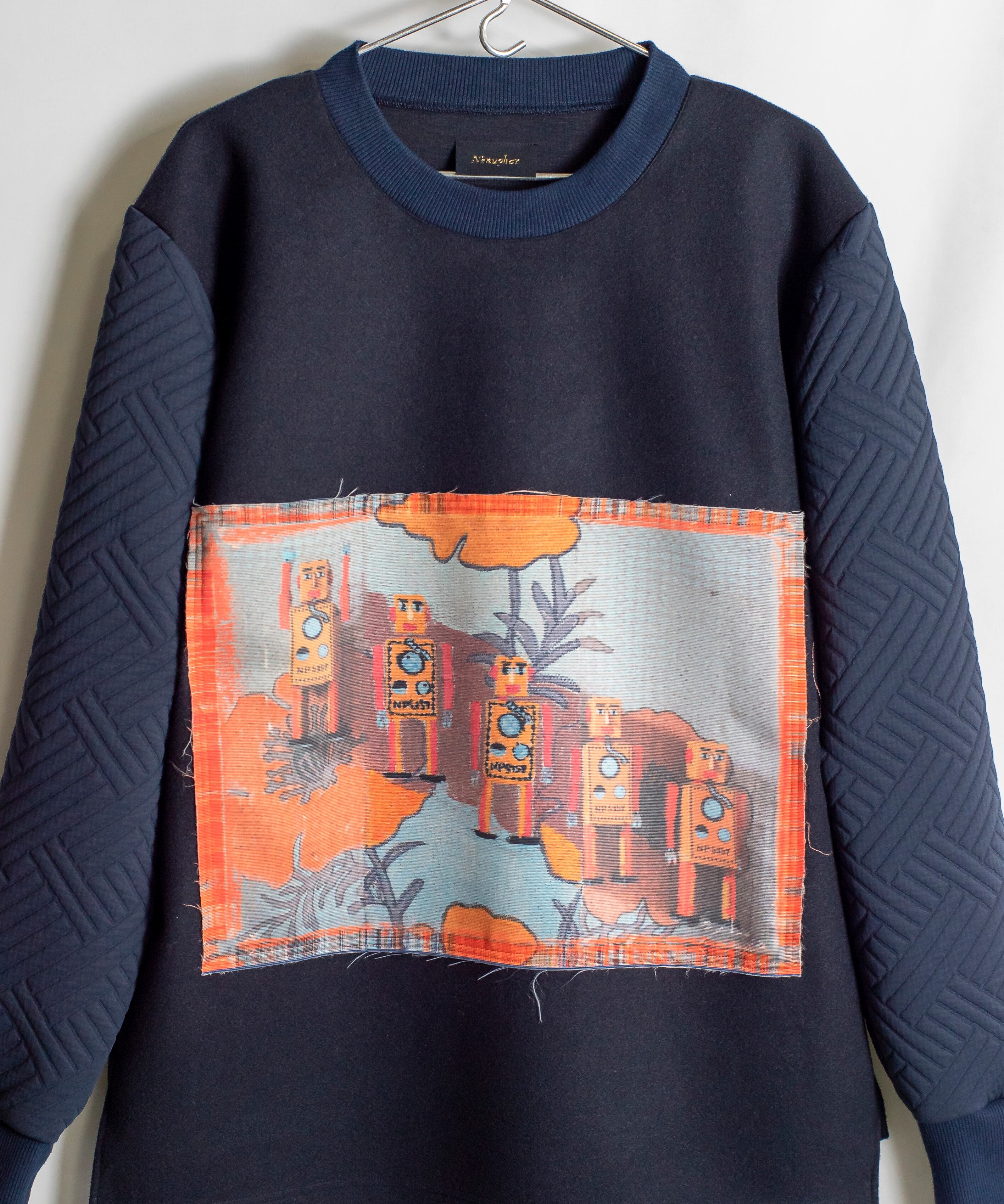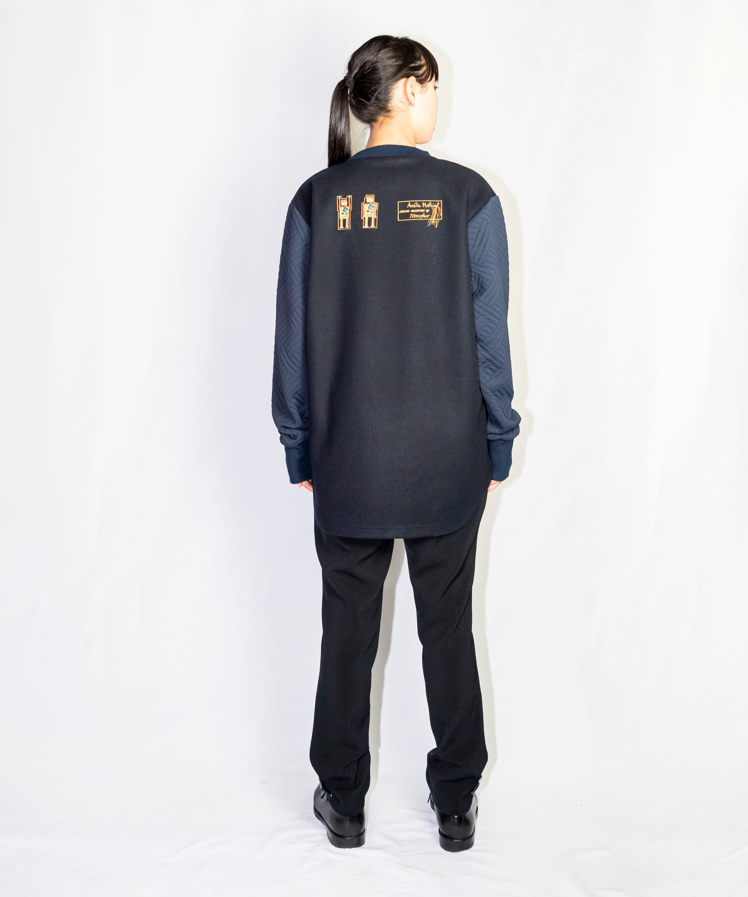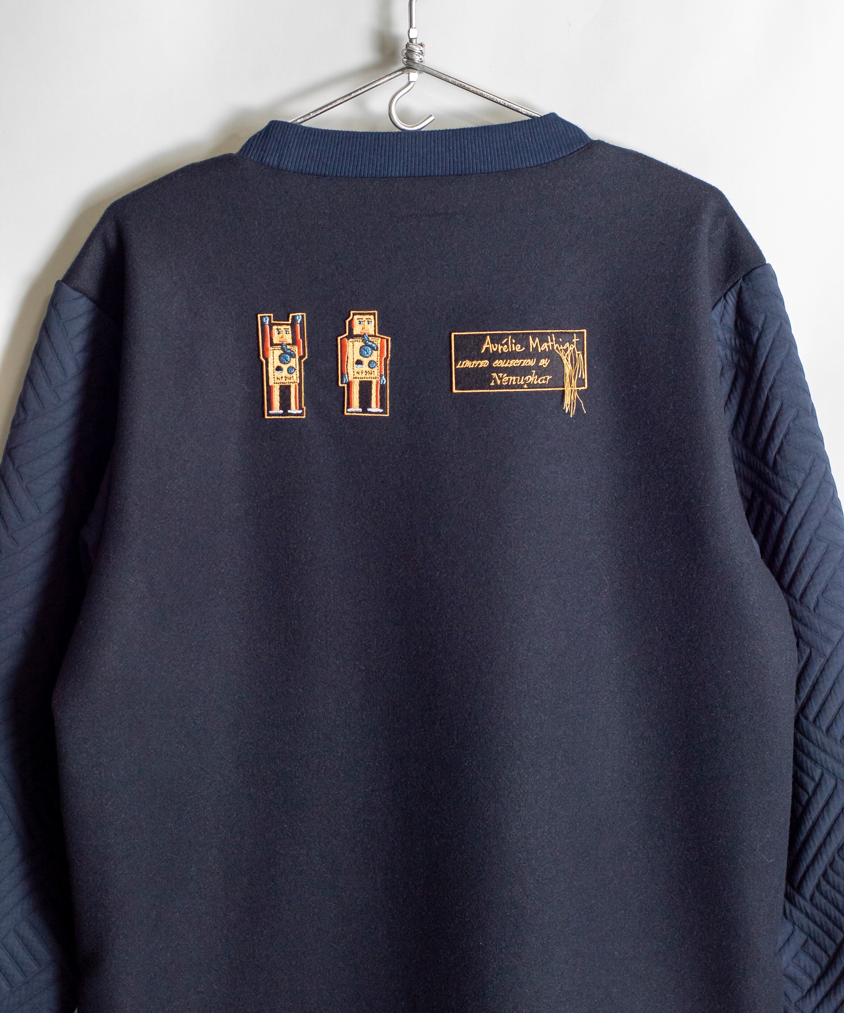 オレリーマティゴ氏による作品、マティゴンのロボットワッペンと、オレリーのサインを入れたロゴ、Aurélie Mathigo LIMITED COLLECTION BY N'enupharの刺繍を施したワッペンをバックヨークにあしらった。
