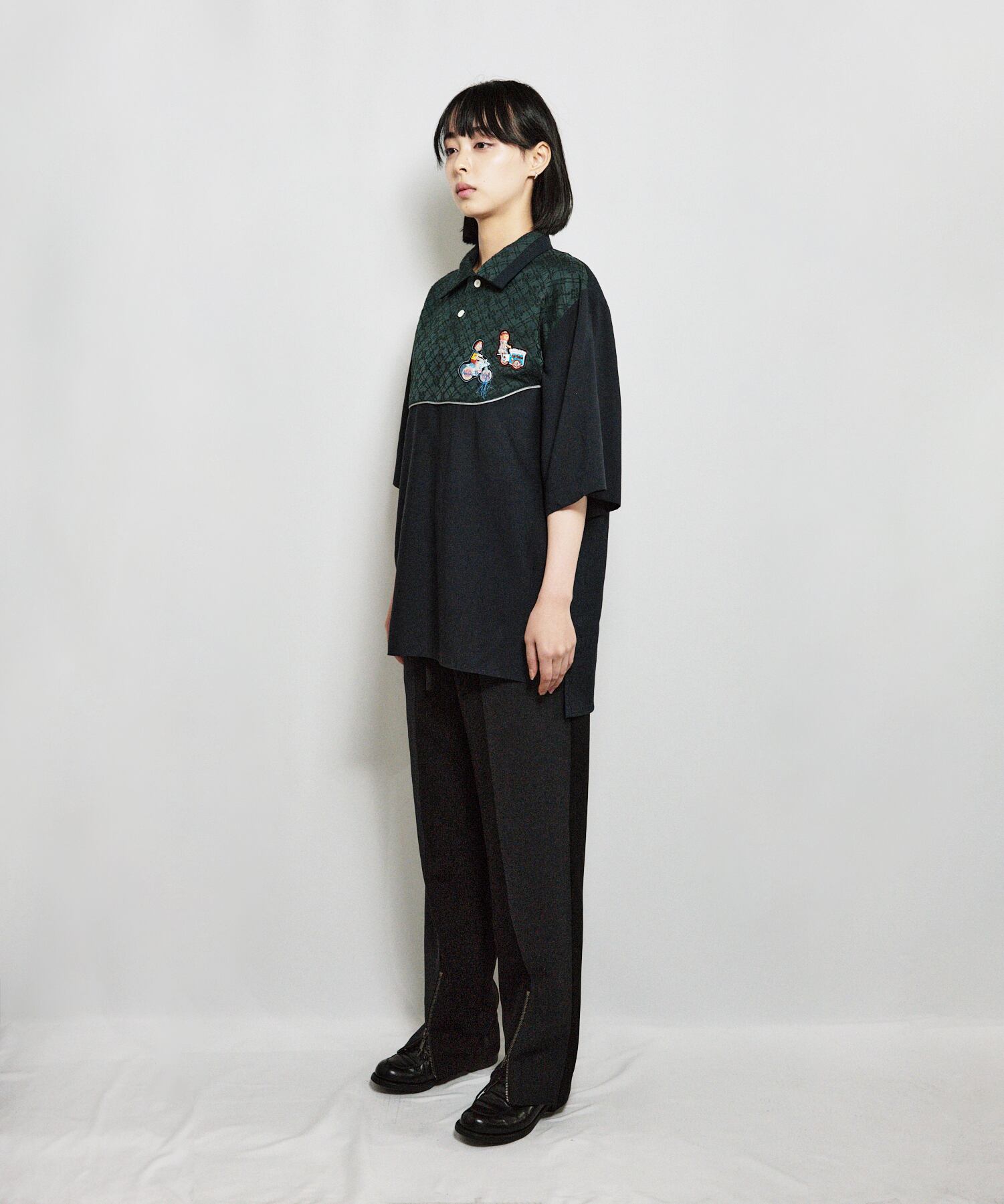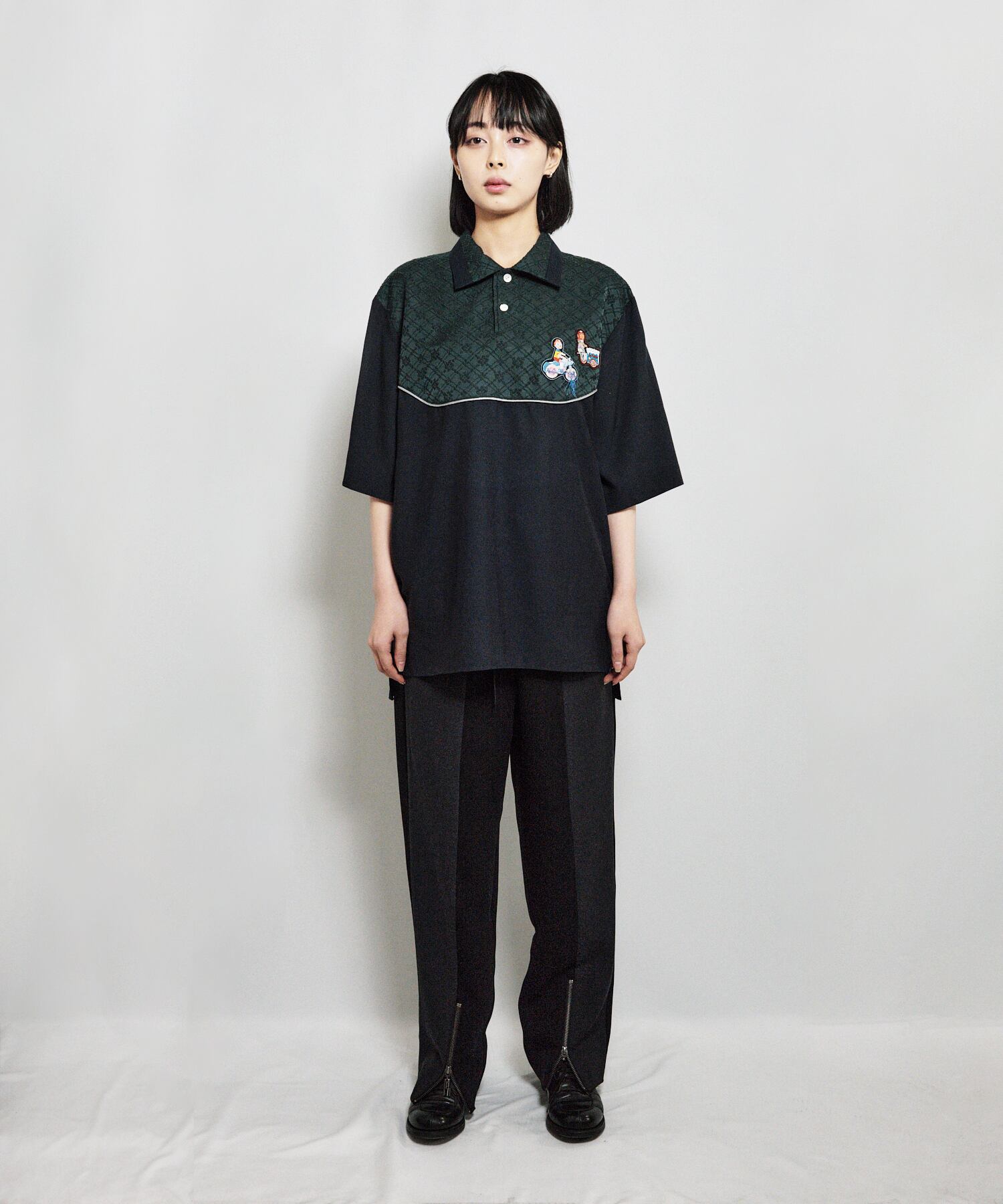 衿に生地を切り替えを入れ、ポロシャツ仕様にする事で、モードカジュアルな雰囲気に仕上げた。