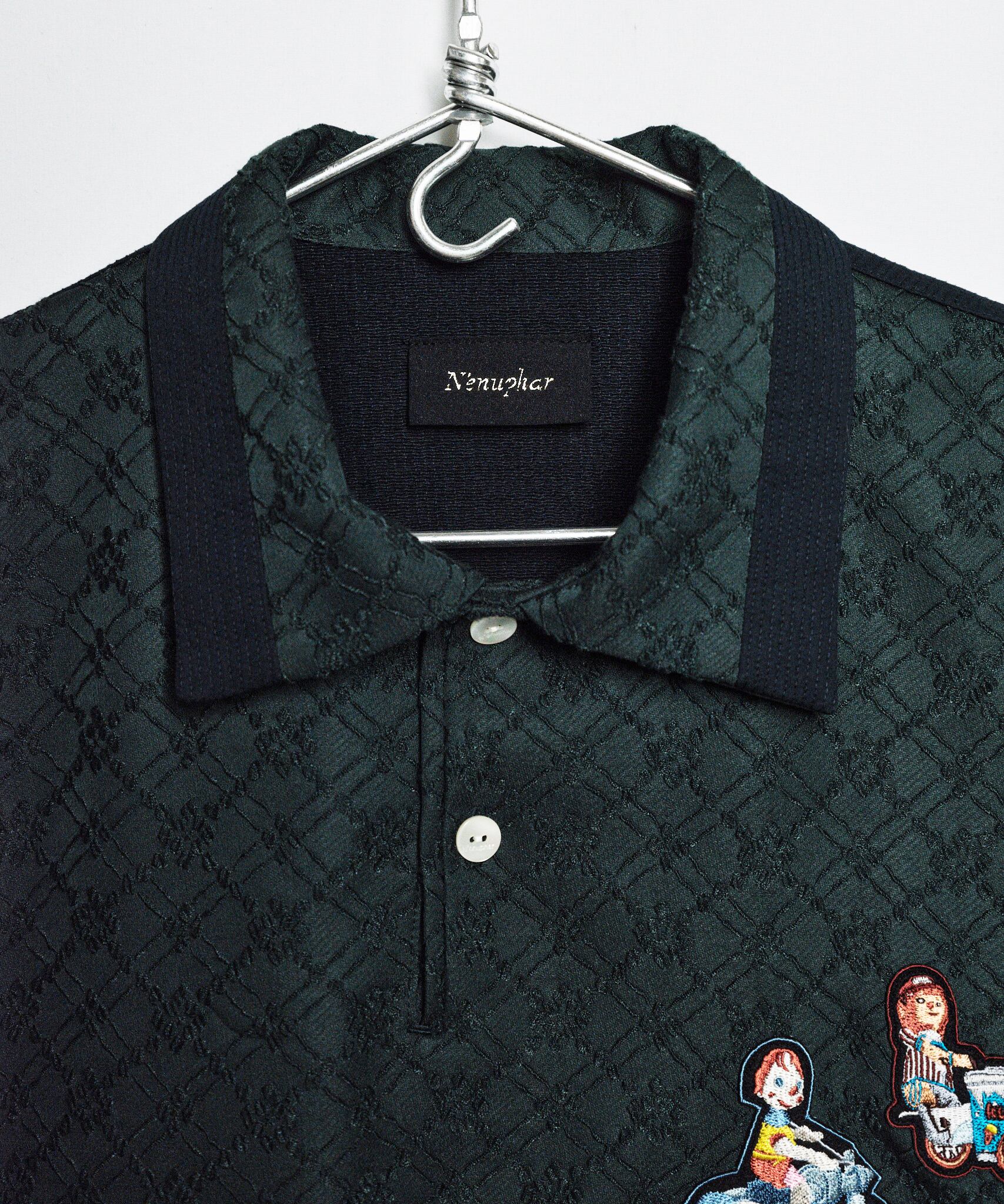 前身上部には刺繍を施したかのような凹凸を出したジャガード織素材を使用。