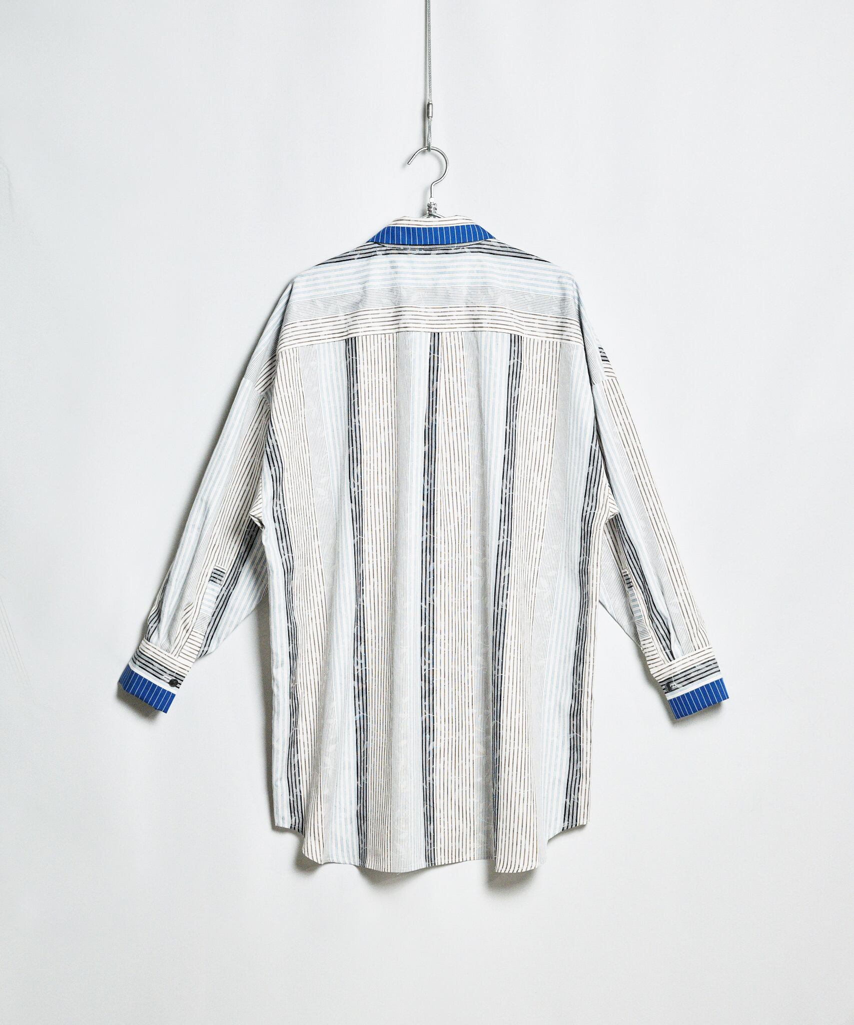 シルエットはオーバーサイズのストライプジャガード織りロングシャツ。