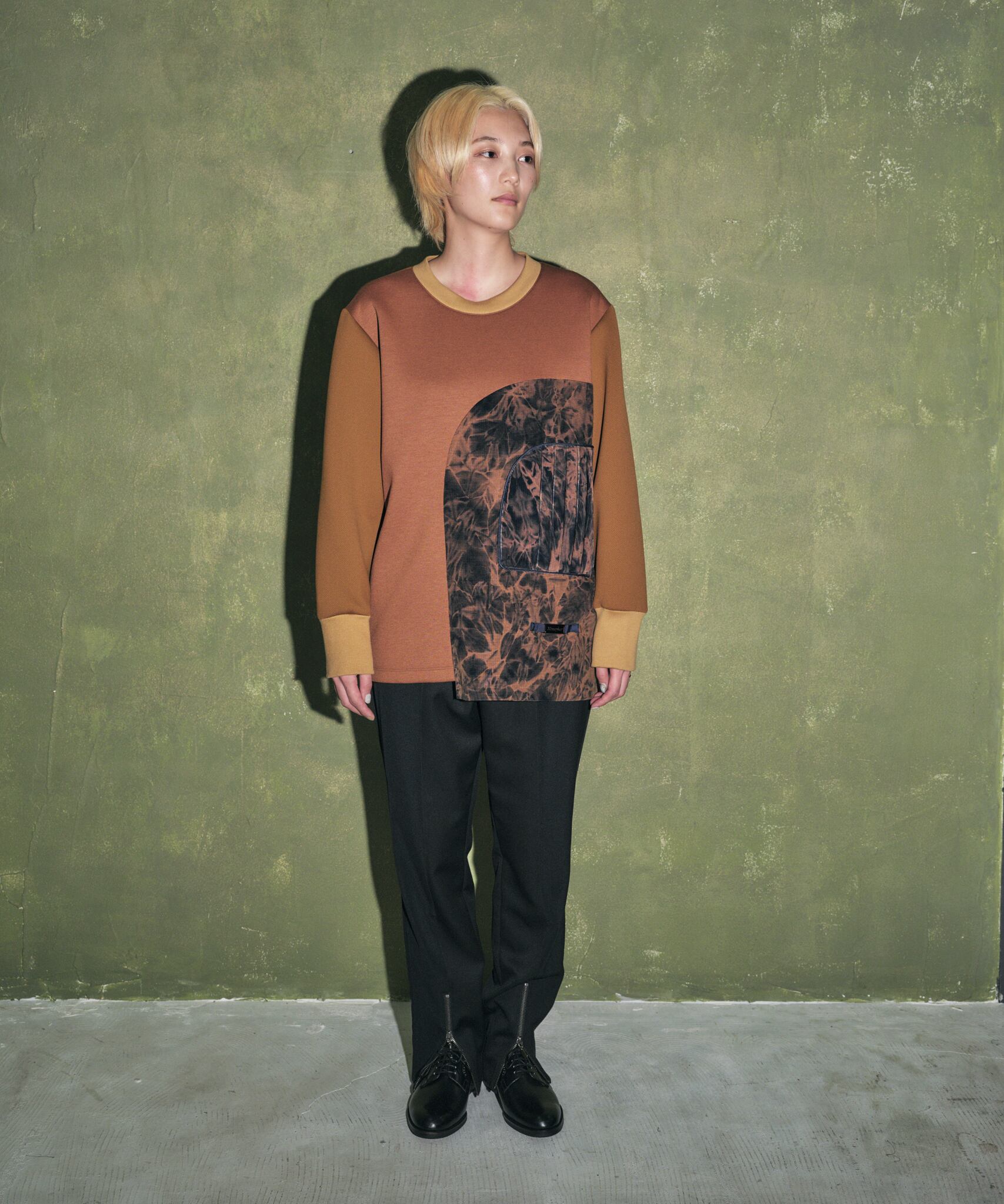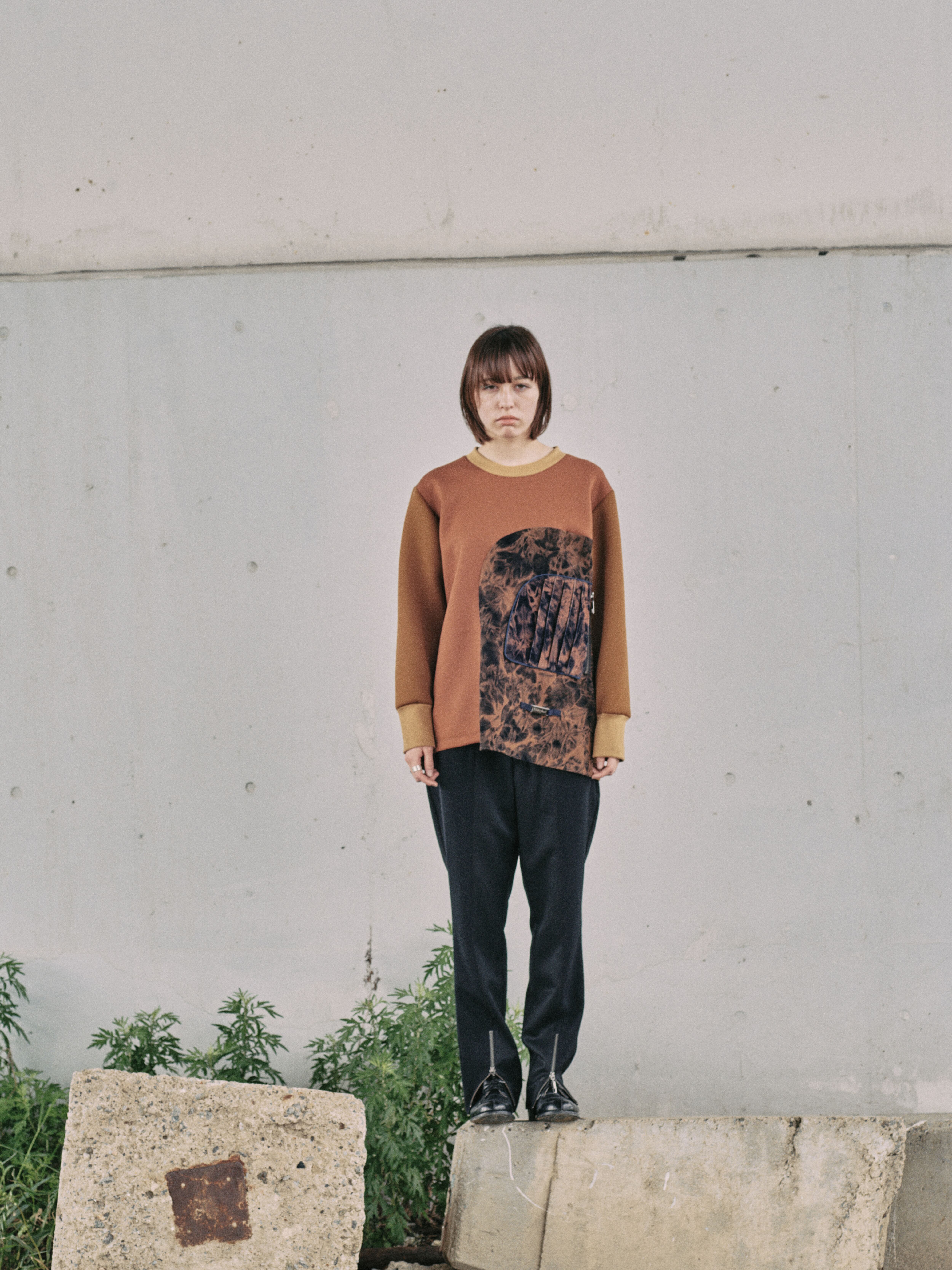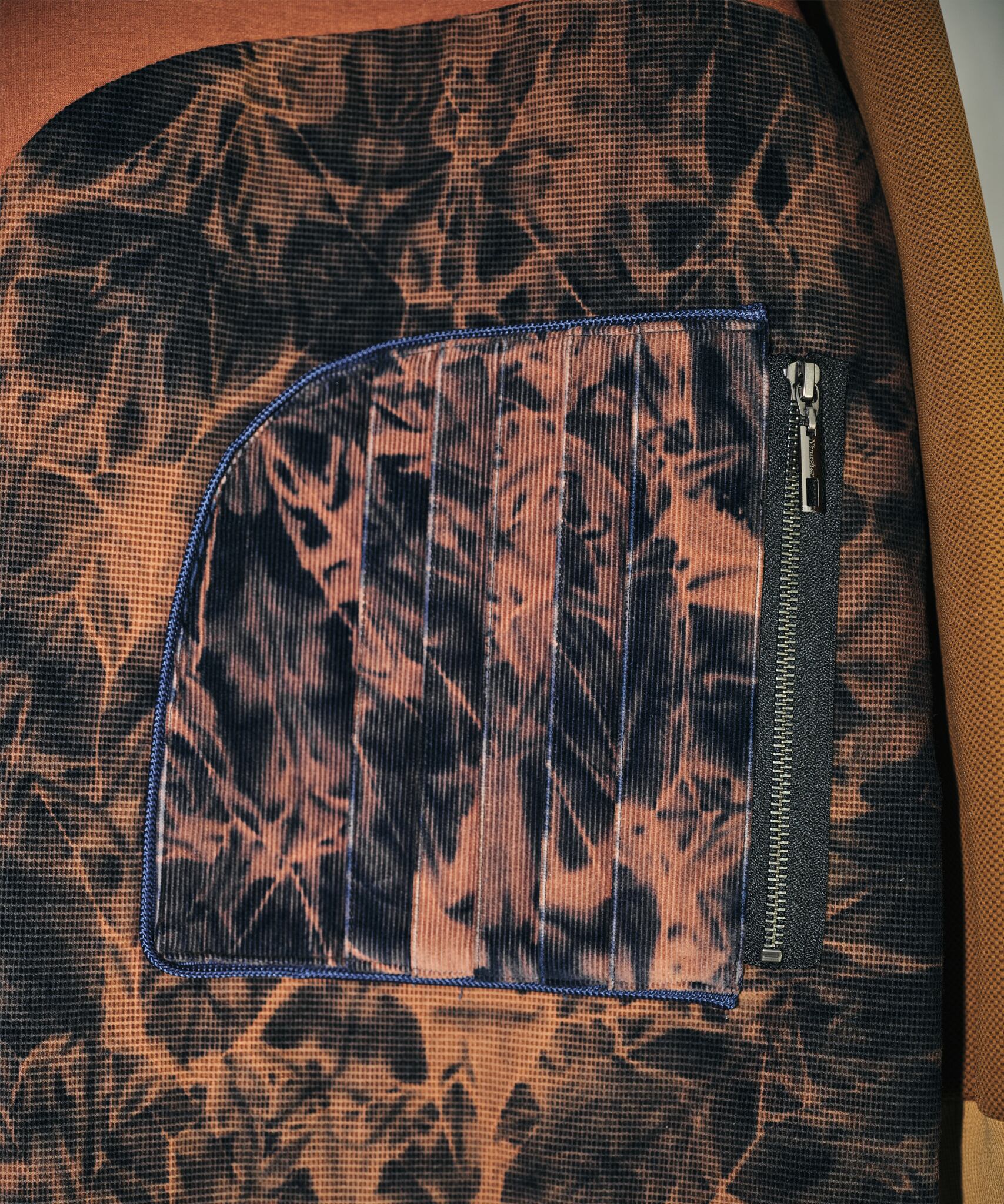 トップのデザイン部分は、コーデュロイ素材を「カゴ染め」の技術を用いて、ブリーチ加工を施した、ヴィンテージの風合いを表現した2種類の生地を使用。