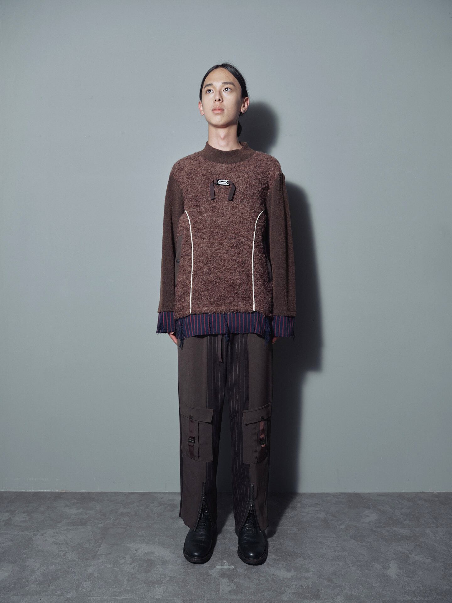 袖口リブにはストライプフリンジニット生地を切り替えた。